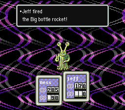 During battle Jeff has the exclusive ability to spy on an enemy. The spy command allows Jeff to determine many of the opponent’s physical statistics (such as offense and defense) as well as any weaknesses it might have to certain PSI attacks. If he’s lucky, Jeff might even find an item the enemy was hiding and immediately add it to his inventory.