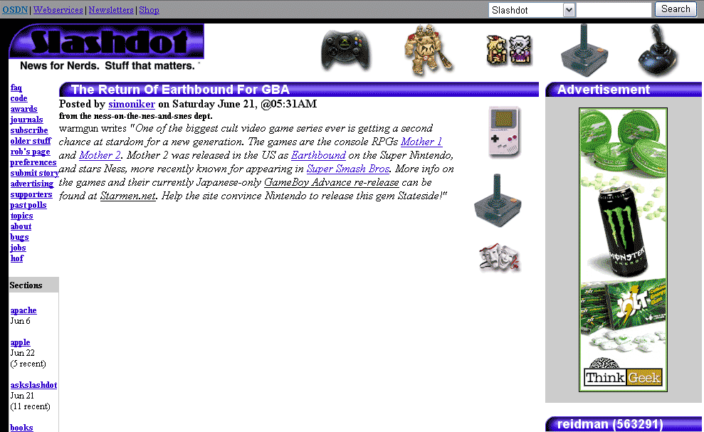 The editors over at Slashdot Games were kind enough to put through a submission titled "The Return of EarthBound on GBA". Our hits shot up and we were able to spread a little EarthBound love.